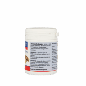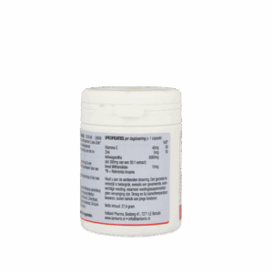 Ashwagandha (Withania somnifera) Wortelextract, Capsule (Hydroxypropyl Methylcellulose), Vitamine C (Ascorbinezuur), Zinkcitraat, Antiklontermiddelen (Magnesiumstearaat, Siliciumdioxide).