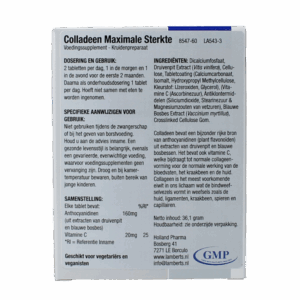 Dicalciumfosfaat, Druivenpit Extract (Vitis vinifera), Cellulose, Tabletcoating (Calciumcarbonaat, Isomalt, Hydroxypropyl Methylcellulose, Kleurstof: IJzeroxiden, Glycerol), (Vitamine C (Ascorbinezuur), Antiklontermiddelen (Siliciumdioxide, Stearinezuur & Magnesiumzouten van vetzuren), Blauwe Bosbes Extract (Vaccinium myrtillus), Crosslinked Cellulose Gom.