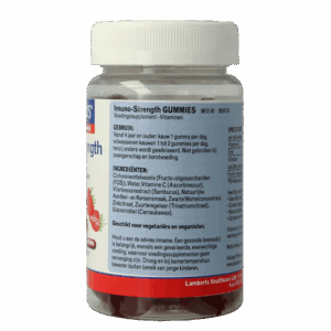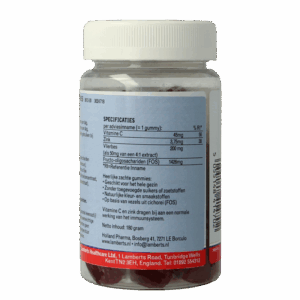 Cichoreiwortelvezels (Fructo-oligosacchariden (FOS)), Water, Vitamine C (Ascorbinezuur), Vlierbessenextract (Sambucus), Natuurlijke Aardbei- en Kersensmaak, Zwarte Wortelconcentraat, Zinkcitraat, Zuurteregelaar (Trinatriumcitraat), Glansmiddel (Carnaubawas).