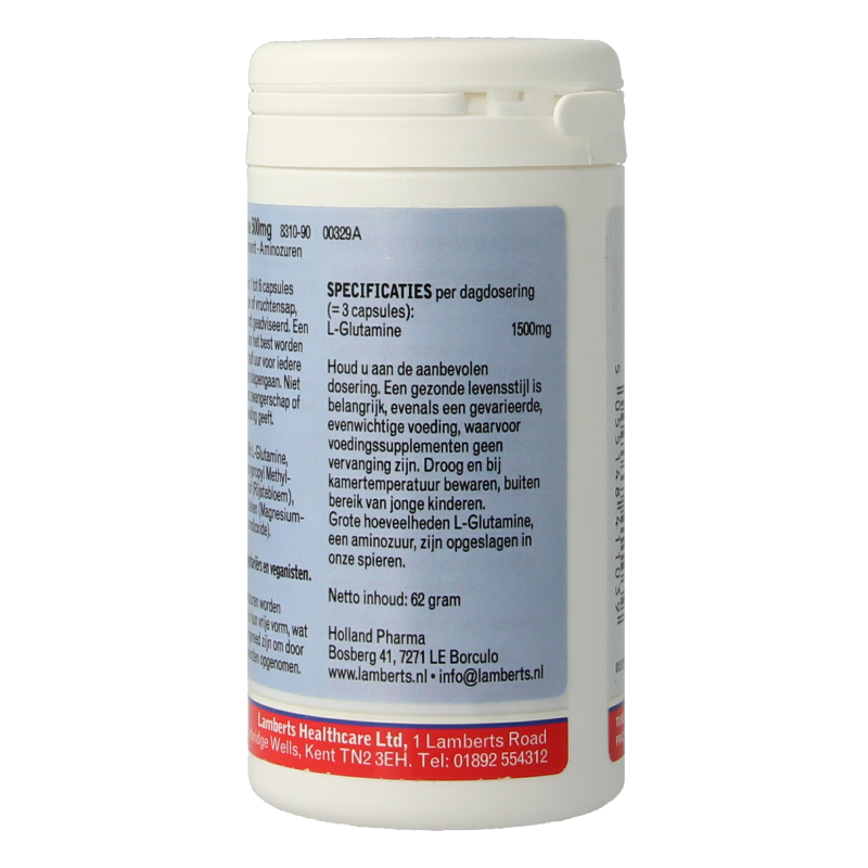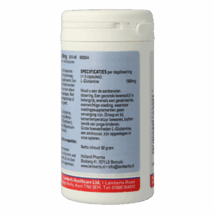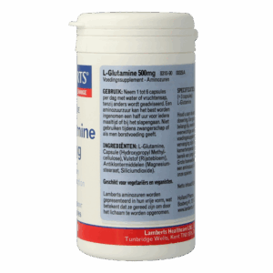 L-Glutamine, Capsule (Geleermiddel: Hydroxypropyl Methylcellulose), Vulstof (Rijstebloem), Antiklontermiddelen (Magnesiumzouten van vetzuren, Siliciumdioxide).