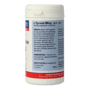 L-Tyrosine, Capsule (Hydroxypropyl Methylcellulose), Antiklontermiddelen (Magnesiumzouten van vetzuren & Siliciumdioxide).